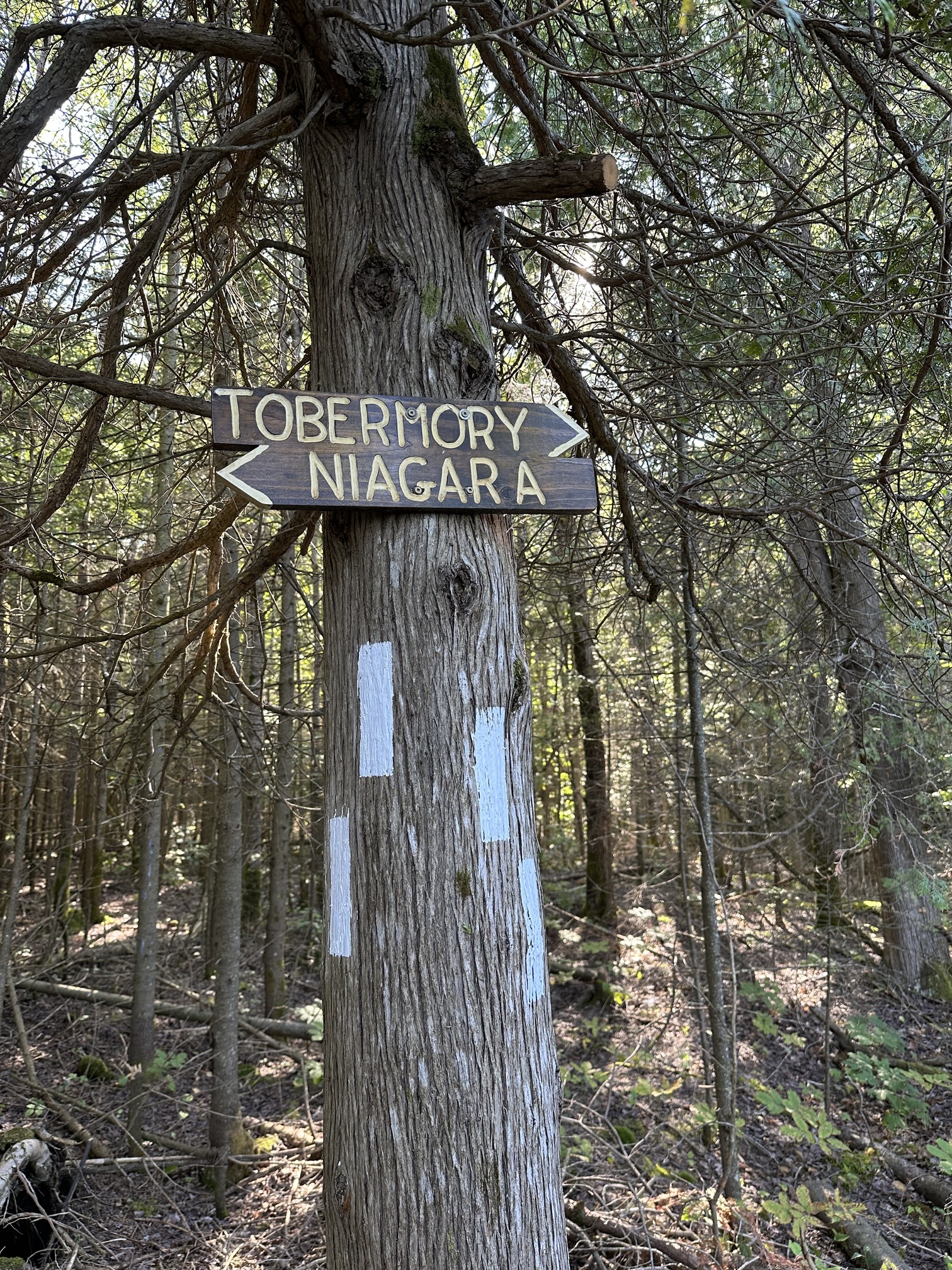 The Bruce trail runs from Tobermory to Niagara. This directional sign is technically helpful, but as the total distance is over 890 km, it is perhaps somewhat misleading.