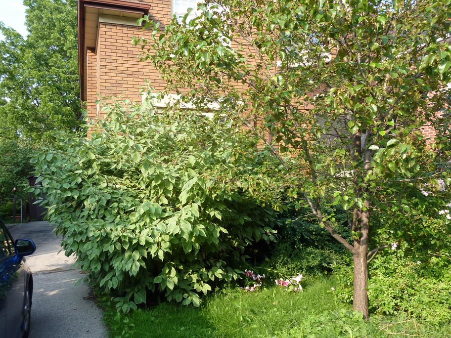 The fast-growing dogwood encroaches on the driveway.