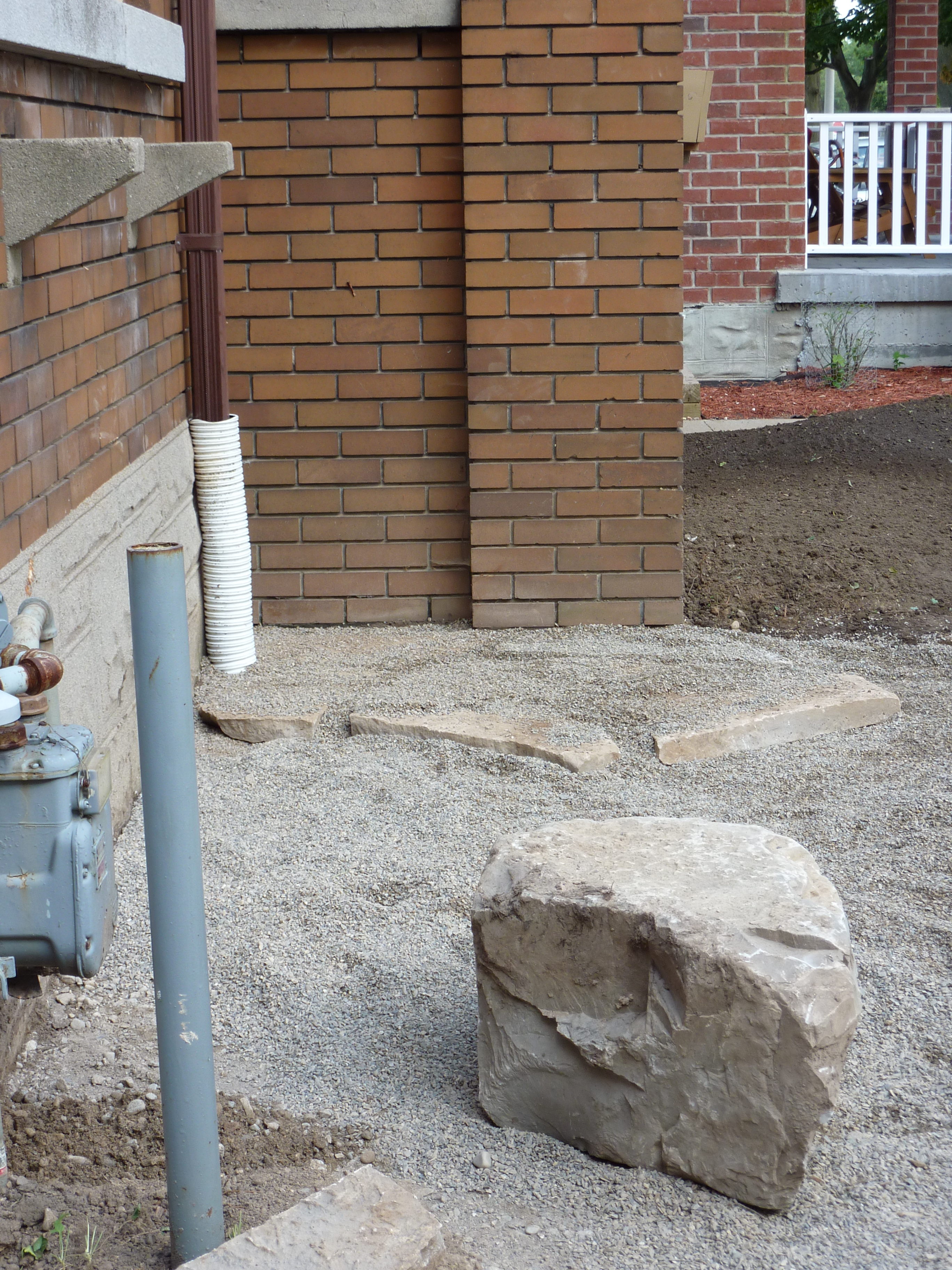 The downspout is routed under the patio and away from the house, into an underground French drain.