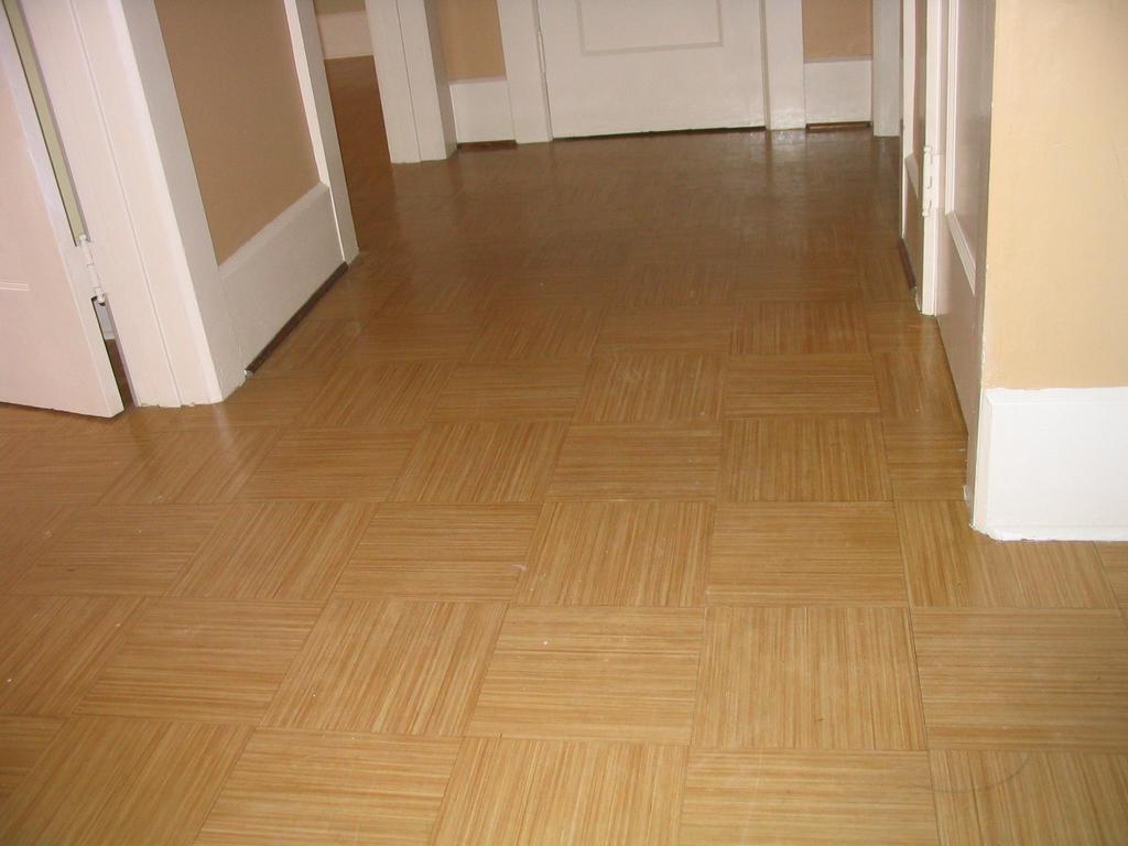 All of upstairs (except the bathroom) was covered in vinyl tile. Blech. Luckily, it turned out that there was wood in good shape under it, so we had the tile (and the plywood it was attached to) ripped out, and refinished the floor underneath it.