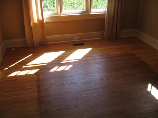The previous owners had a big rug here; the last time they refinished the floor, they did it themselves, and didn't bother to do the part under the rug. There were also huge roofing nails used to nail down the floor; they were still there under the rug, and everywhere else, there were big putty-filled holes.