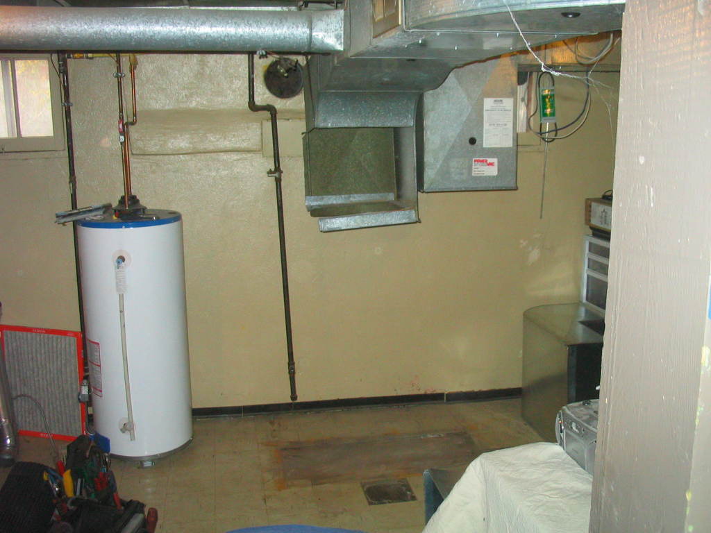 The furnace is gone! Throughout the day, it stayed a steady 16C in the house. Note at the top, there's a vent just feet from the furnace. This is poor, since lots of air escapes there, rather than going to the rest of the house.