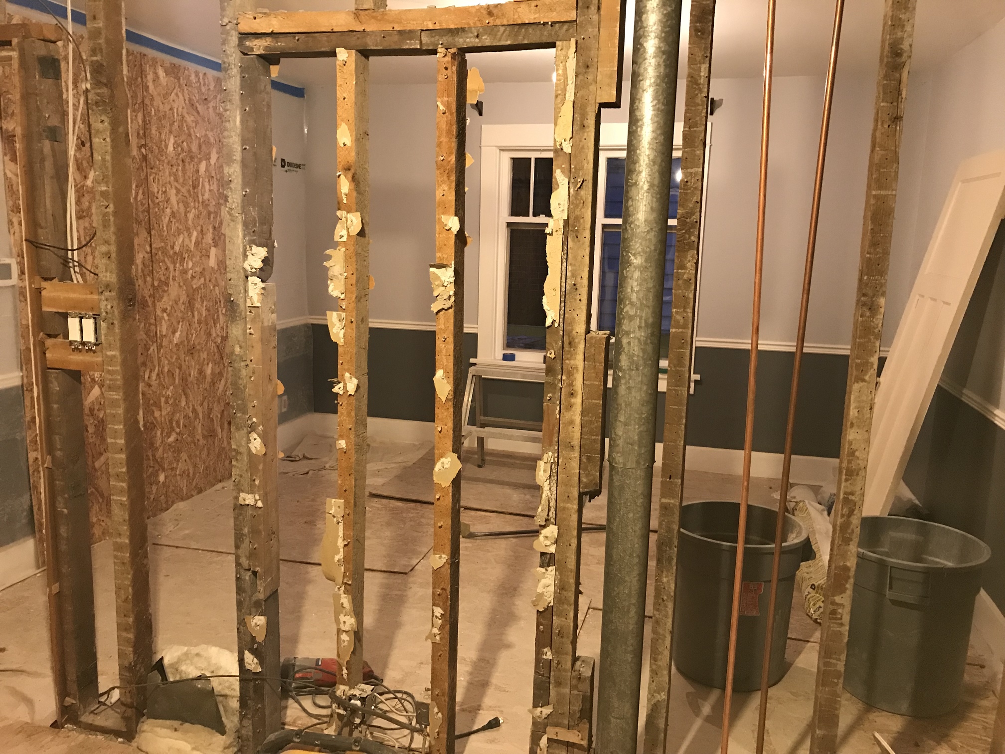 The wall (but not the structural support) between the kitchen and dining room is down.