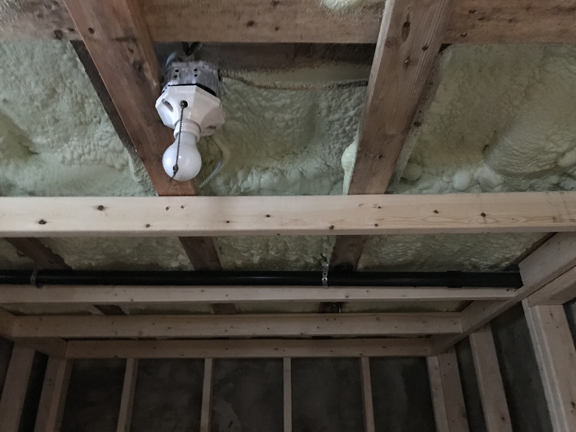 In the room under the back kitchen, the framing is pretty much done, including the half of the room that has to have a lower ceiling because something something condensation. The plumbing connecting the kitchen drain to the stack is also complete.