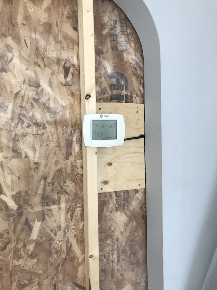 There was a hole in the wall between the construction side and the living side of the house so that the thermostat (which was on the construction side) could be exposed to the air temperature we're living in. Today, our cat Finlay figured out he could jump through it to see what all the commotion was on the construction side. So we had them seal up the hole, but move the thermostat to "our" side.