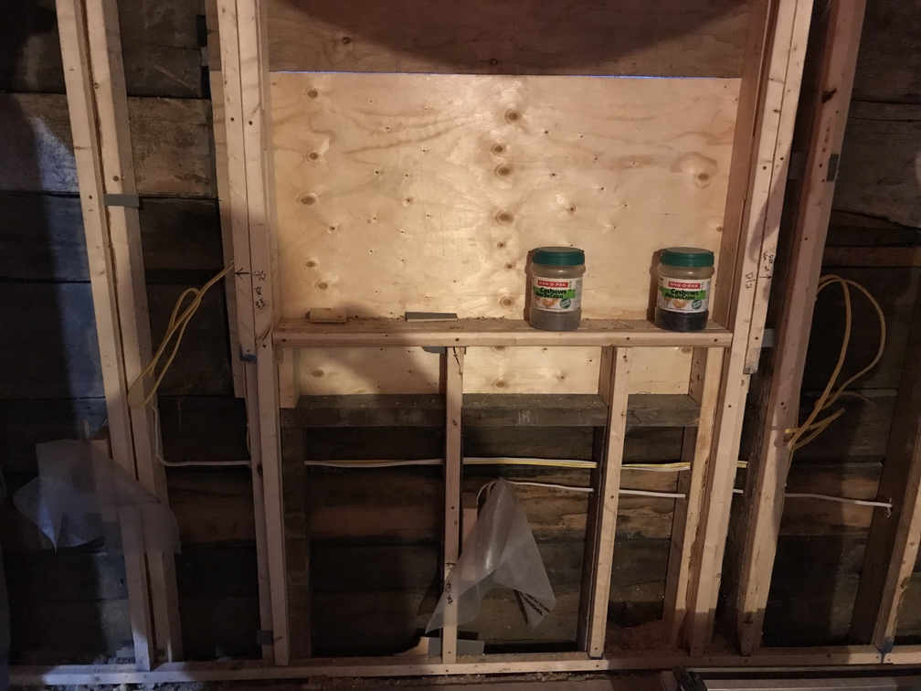 The framing and wiring of the outside wall of the front kitchen, where the new window will be