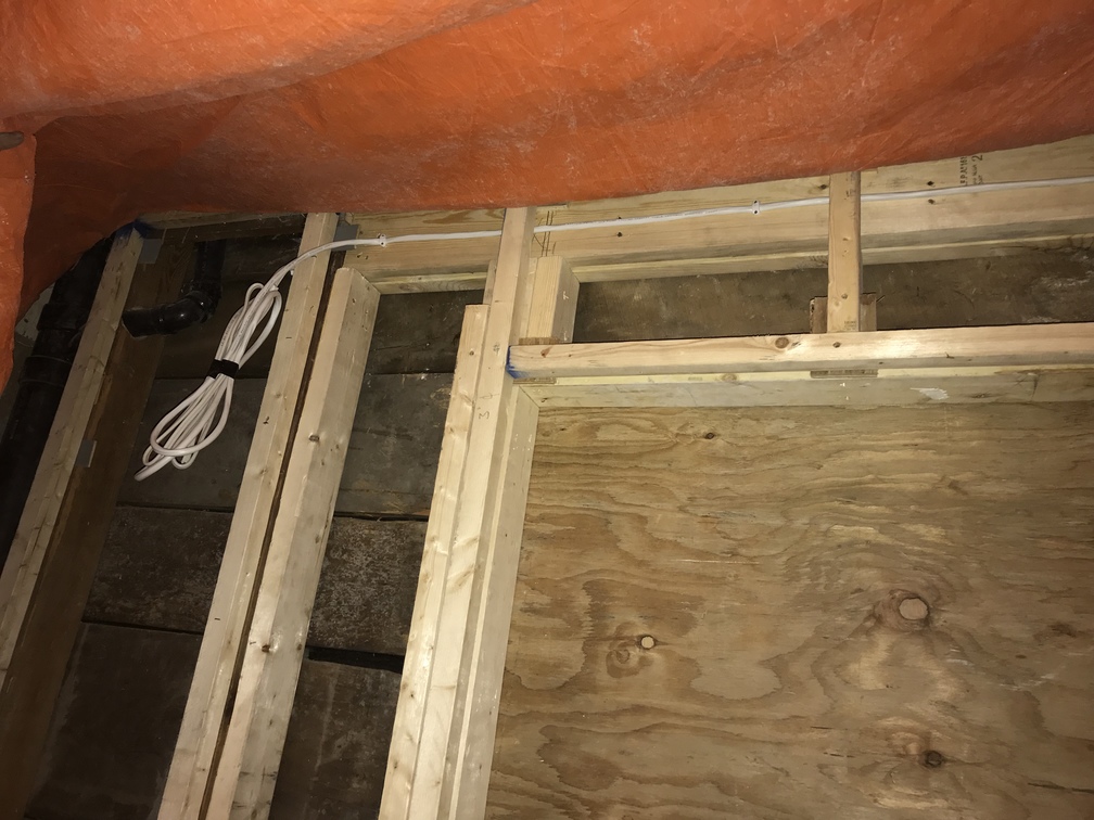 The low-voltage wiring for the coloured LED project, going between the two upper cabinets on that wall