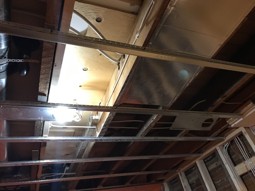 The metal strapping that will hold up the ceiling (level!), and cutouts for the potlights that will be there