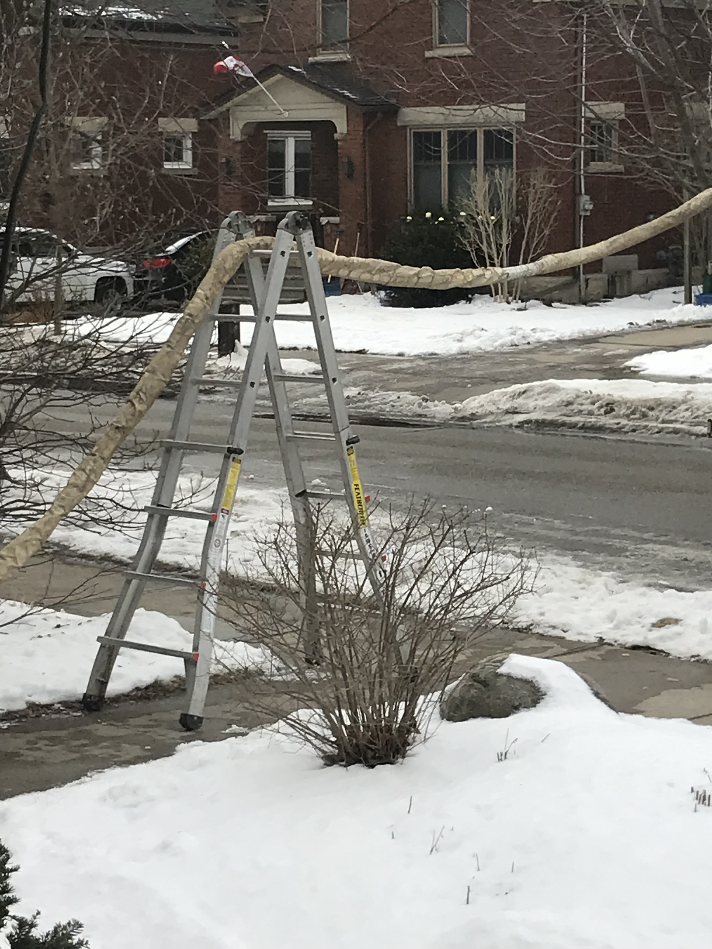Today was spray foam day. In order not to block the sidewalk, they draped their hose from their truck across a ladder placed on the walkway to our house.