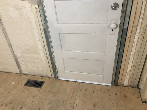 The back kitchen now has a subfloor at the right level. The door had to be cut at the bottom so that it would open with the floor higher (there will be a whole new door going in). The ar vent has also moved to its new location.