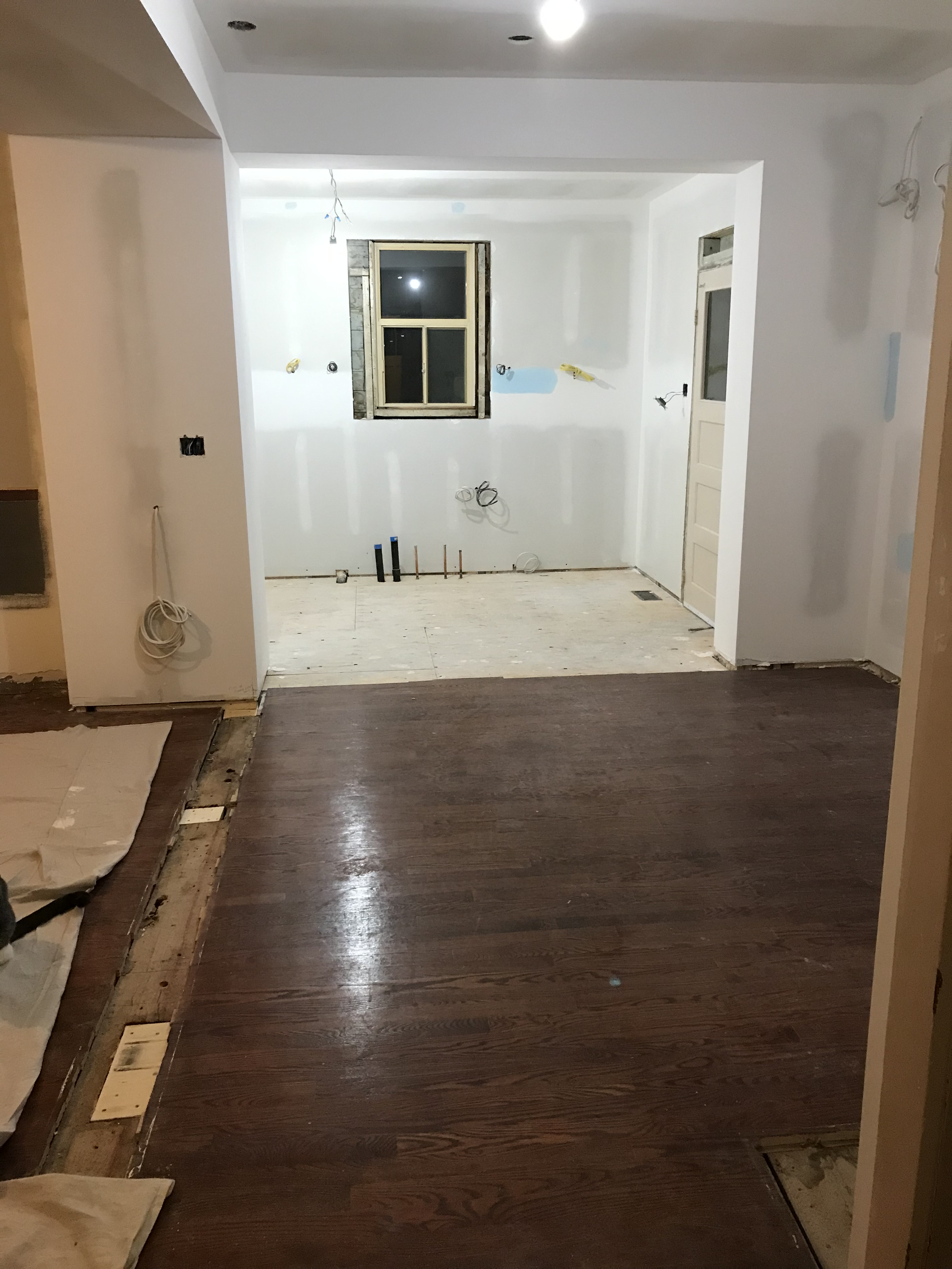 The temporary wall between the foyer and the construction area is down. There's still a door that we can close when the crew is actually working, in order to keep the cats out, but all the construction equipment is out of there! The floors need patching where there used to be walls and cabinets. That'll happen next week.