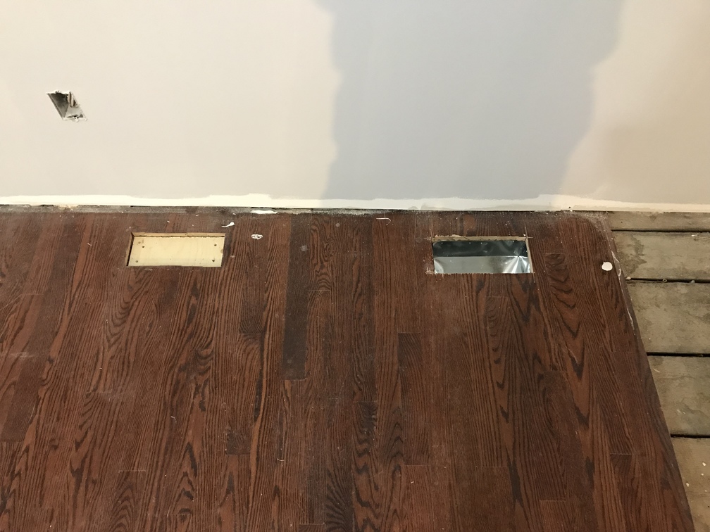 The old vent (left) that will need floor patching and the new vent (right). The new vent will actually come up through a toe kick under the pantry that will eventually be here.