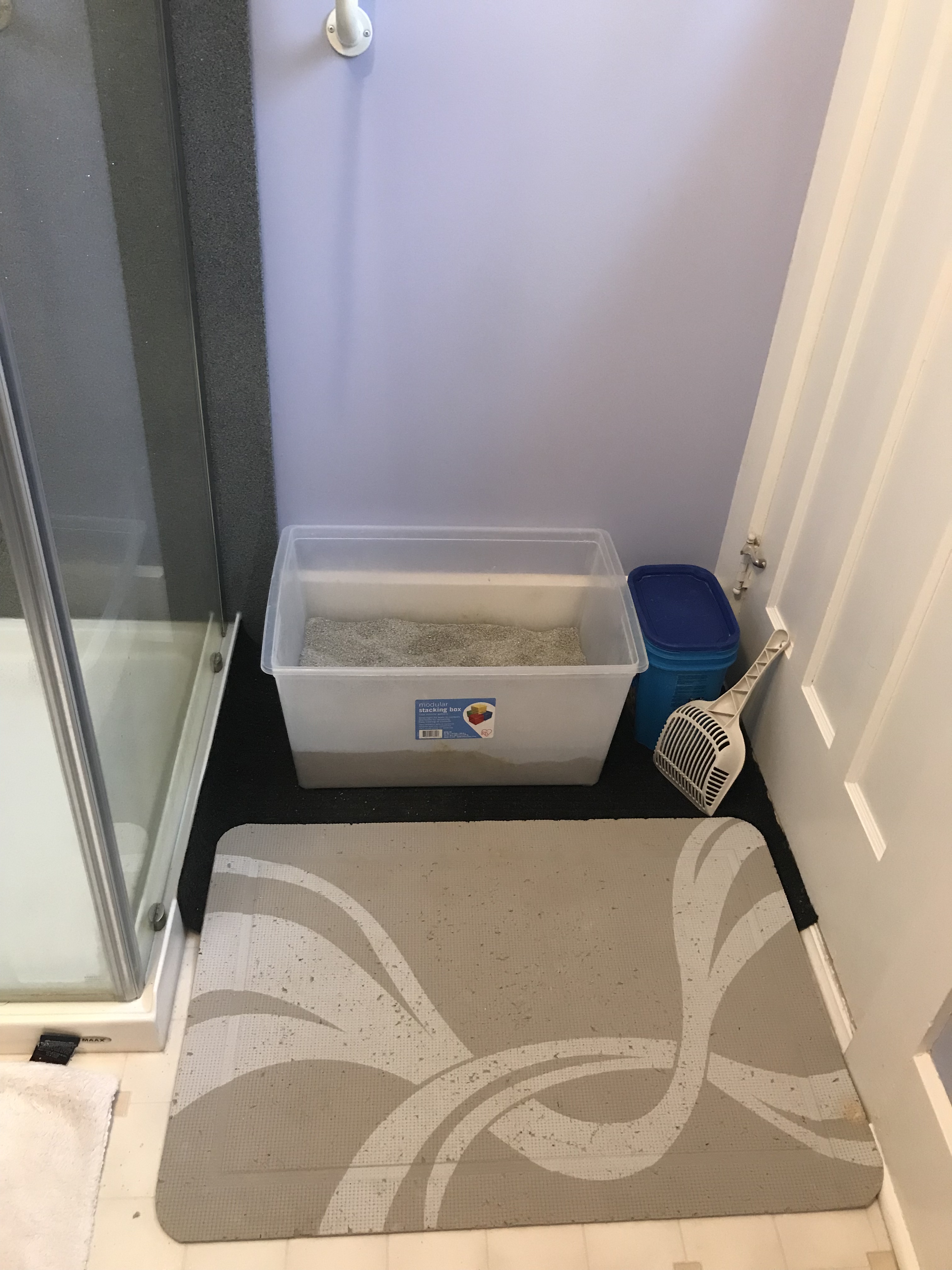 While the floors are under construction, the cats have to be kept out of that space 24/7. Since the path to the basement (where their litter boxes are typically kept) goes through there, we had to move a litter box to the upstairs bathroom for the next little while.