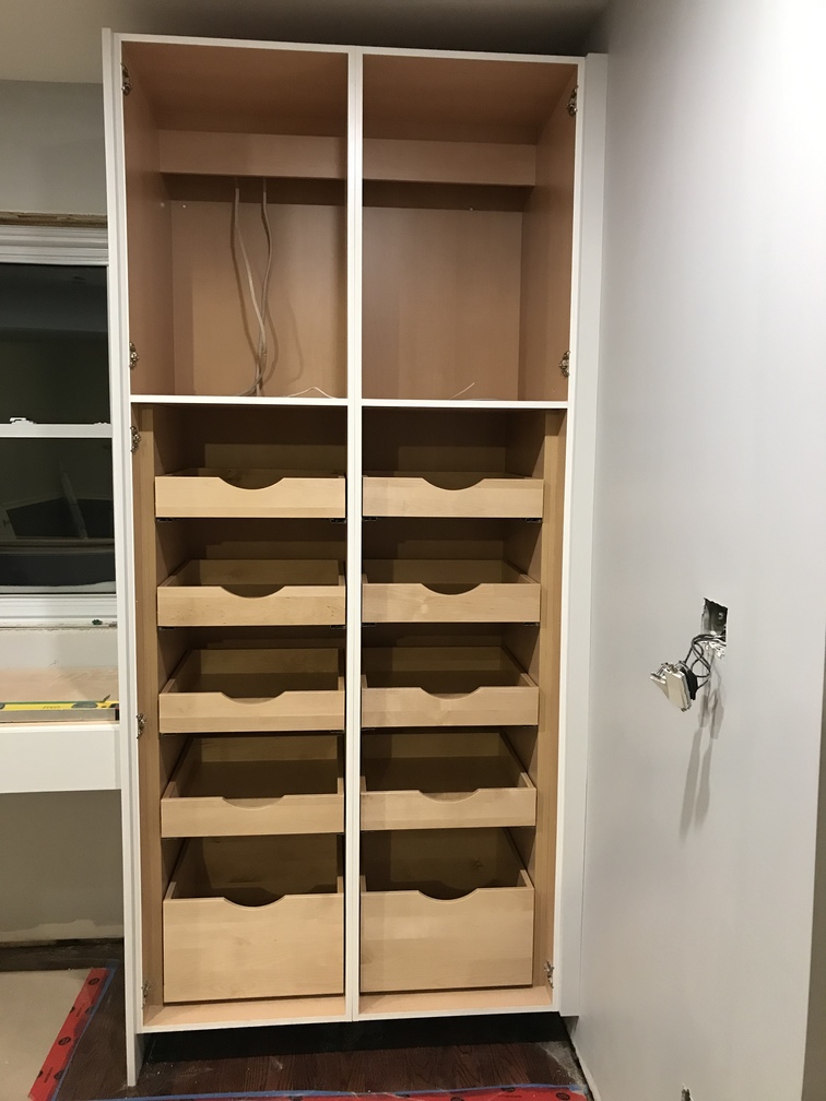 The pantry and drawers are installed.