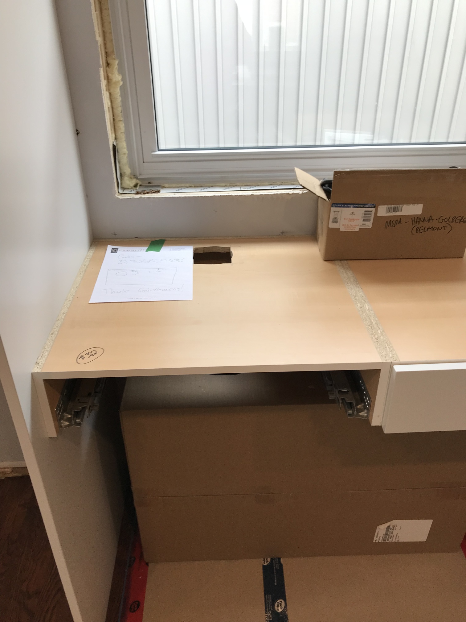 We needed an extra outlet in this space for code reasons, so there will be a pop-up outlet here, and the drawer underneath is being modified to accomodate it.