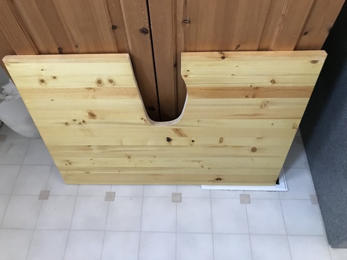Today was the start of the trim work. The shelf under the sink needed a new notch to accommodate the new plumbing.
