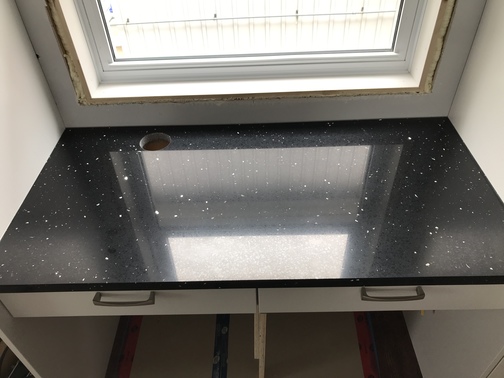 The short counter under the side window is light-flecks-on-black to contrast with the rest of the kitchen.