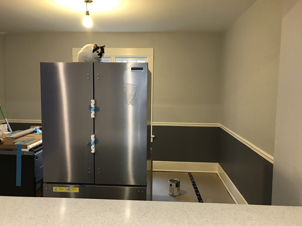 The appliances have arrived. Luna inspects the fridge. The new paint for the bottom half of the dining room is finished.
