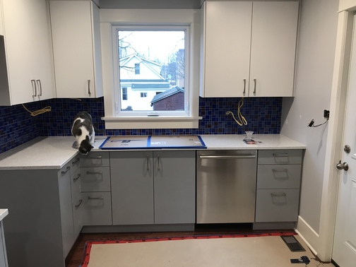 We recovered the sink with cardboard this time (Finlay checks it out). The dishwasher (we didn't have one before!) is installed.