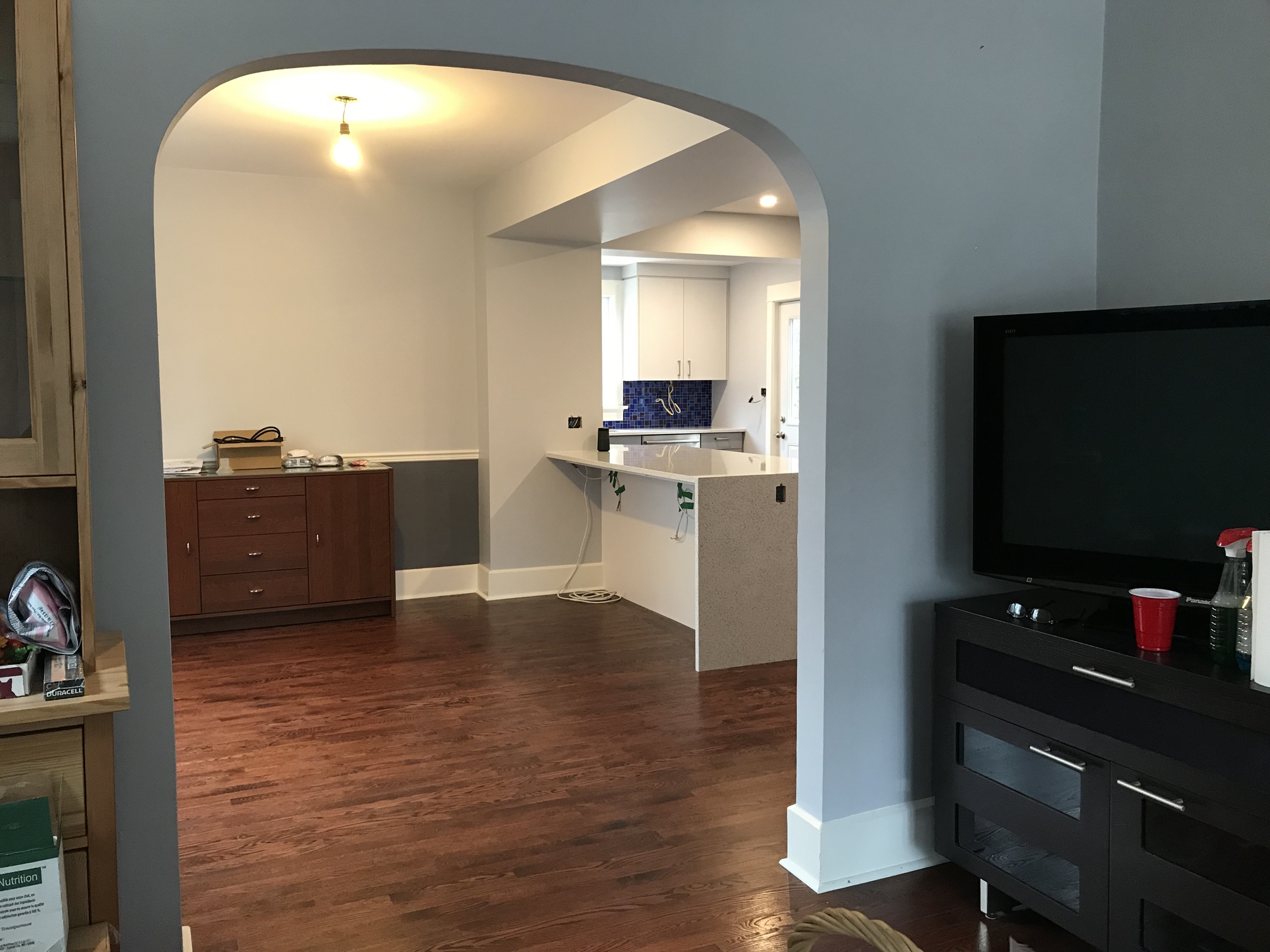 Getting there! The temporary wall between the living room and dining room is now down, and the buffet has been moved back into the dining room. It used to be on the wall that turned into the peninsula, so it's now against a different wall. You can see right to the back door from the living room now.