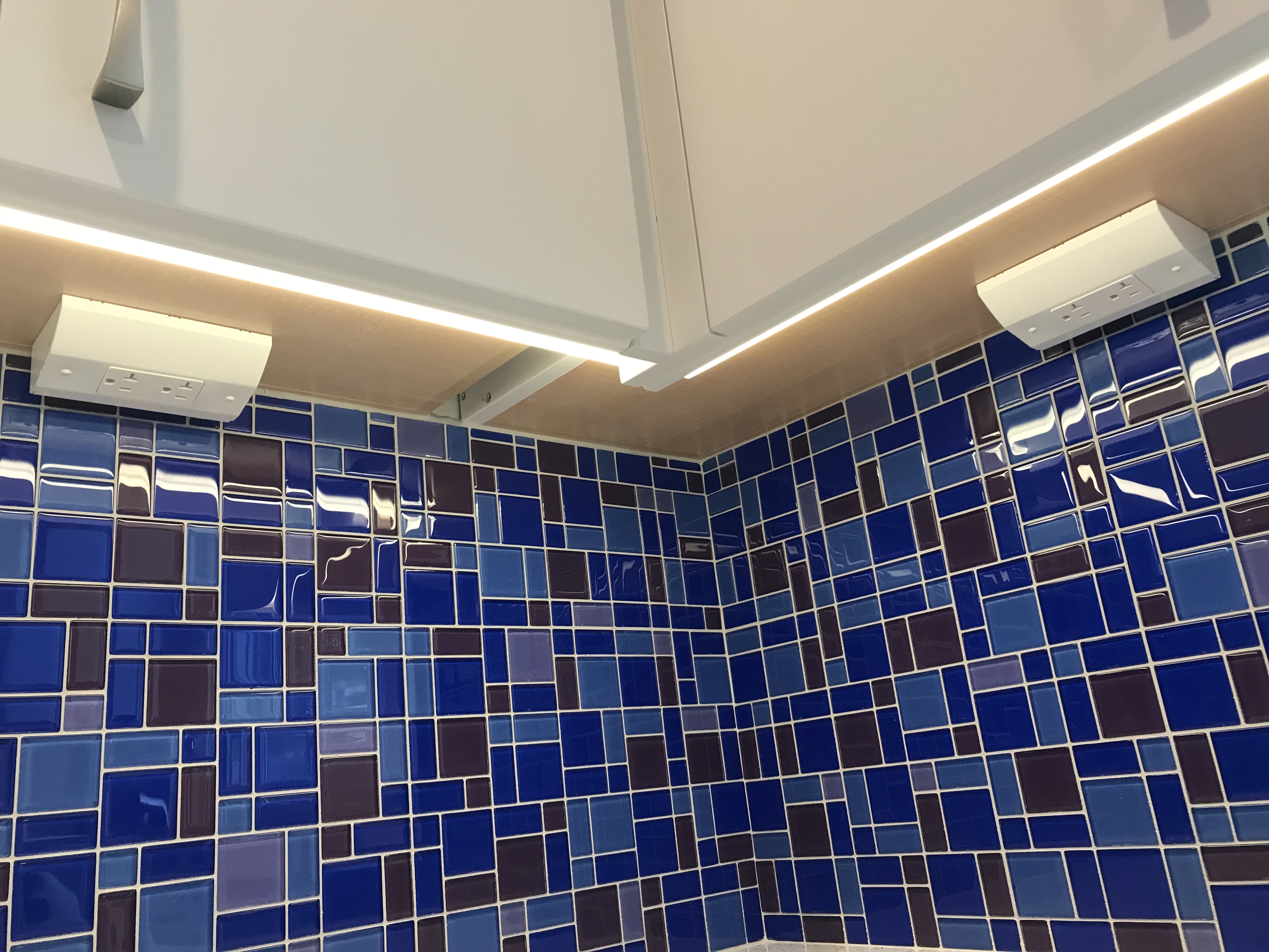 The under-cabinet lighting and outlets have been installed. These are totally hidden from eye level.