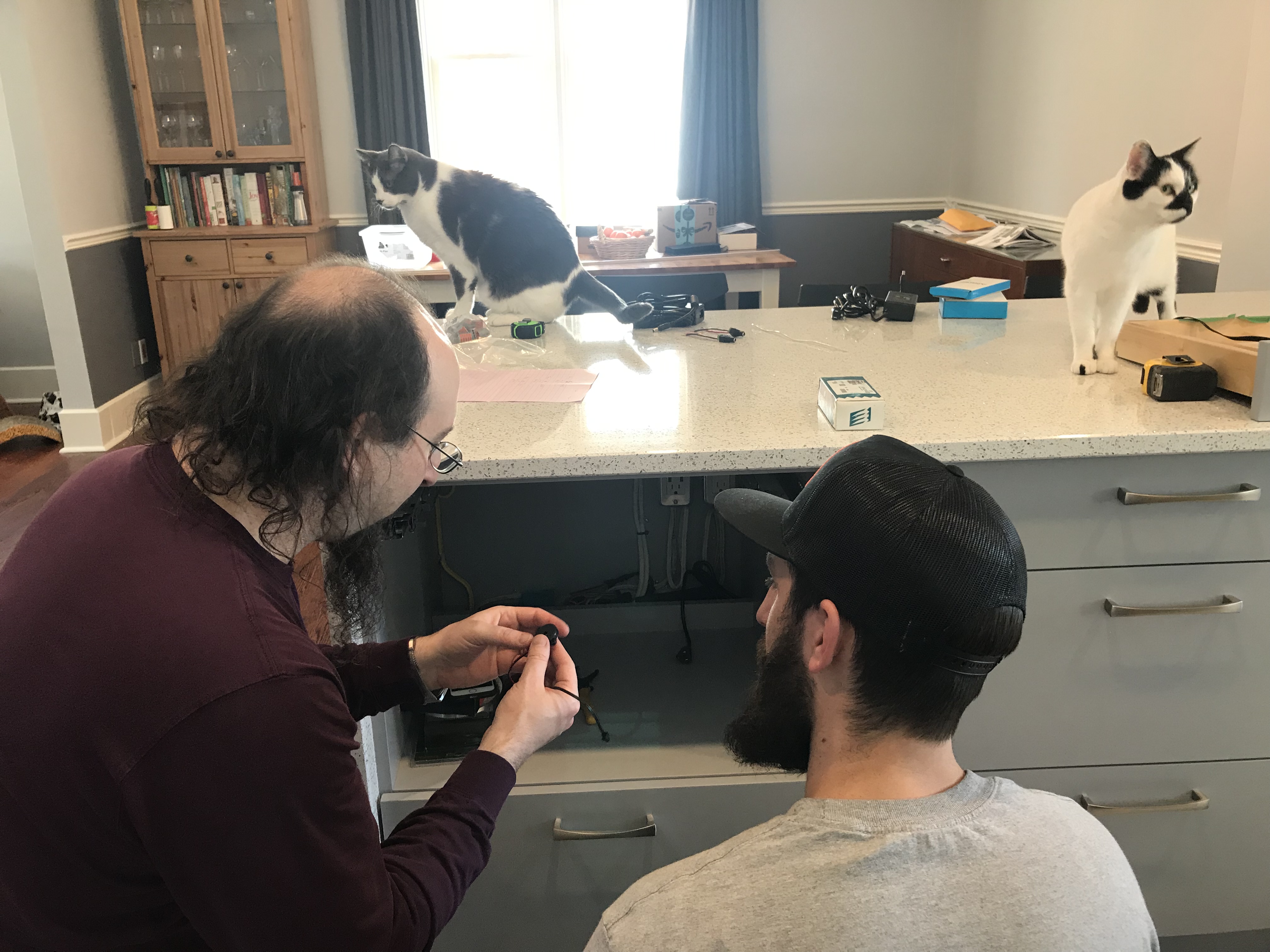 Ian works with the electrician to get the wiring for his LED project installed, mostly in a dedicated space behind the microwave. Finlay and Luna supervise.