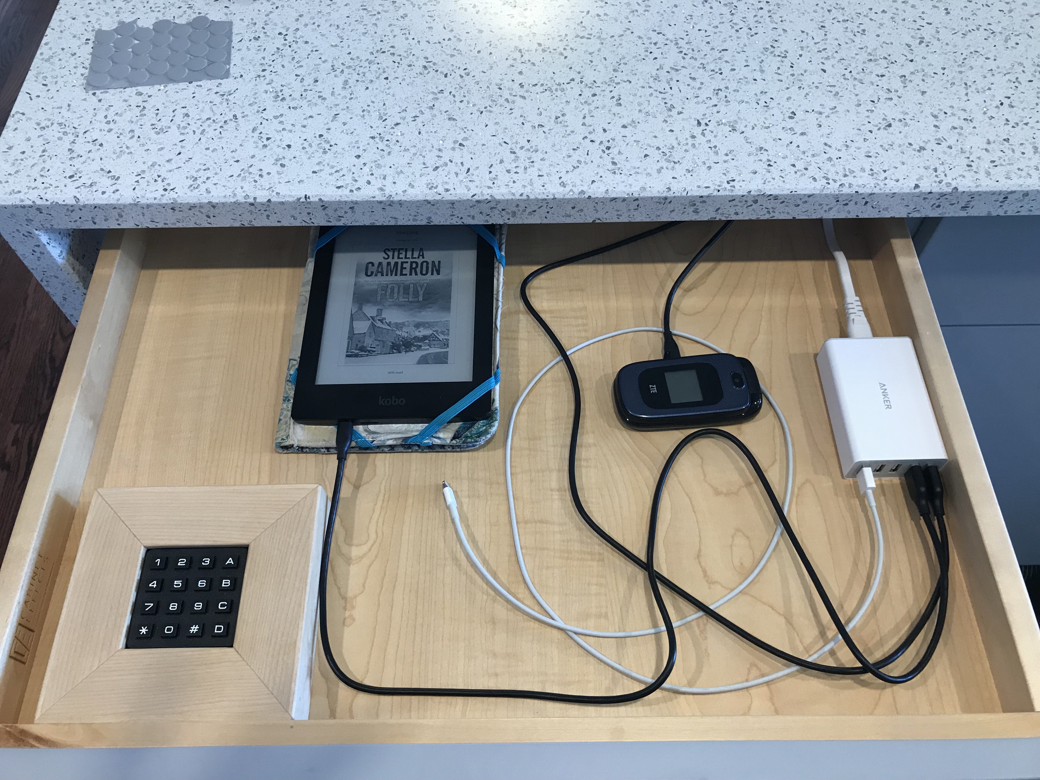The LEDs are controlled with a keypad mounted in the drawer above the microwave. That drawer also contains a USB charging station.