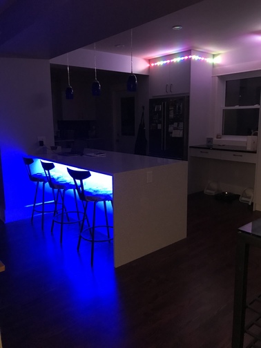 Ian's LED project, almost complete. There are individually controllable lights below the peninsula overhang and above the fridge and pantry.