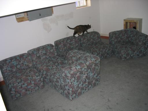 My parents kindly donated a sectional couch, which goes really well colour-wise with both the carpet and the floor. PK explores the couch.