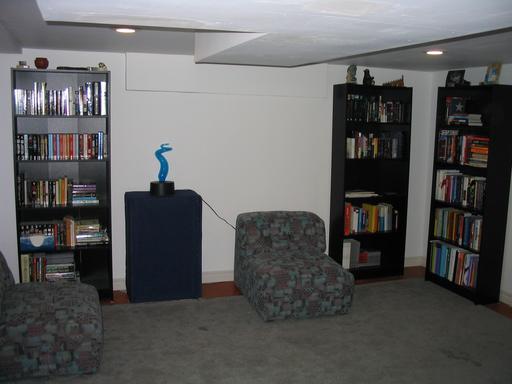 The bookcases are filled (with the boxes of books we hadn't yet unpacked since moving in). We also bought some fabric to cover the ugly main water shutoff.