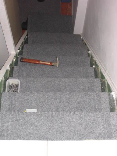 We've unrolled the runner, and are working our way down, nailing it into place.