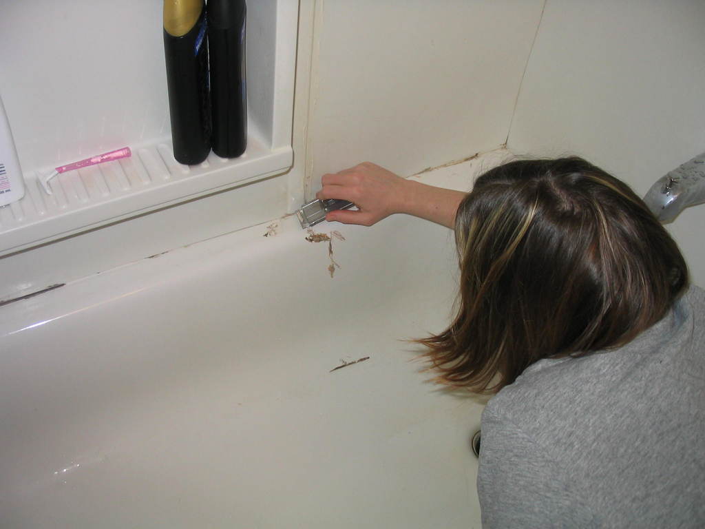Scrape off the old caulk. Make sure it's clean and dry.