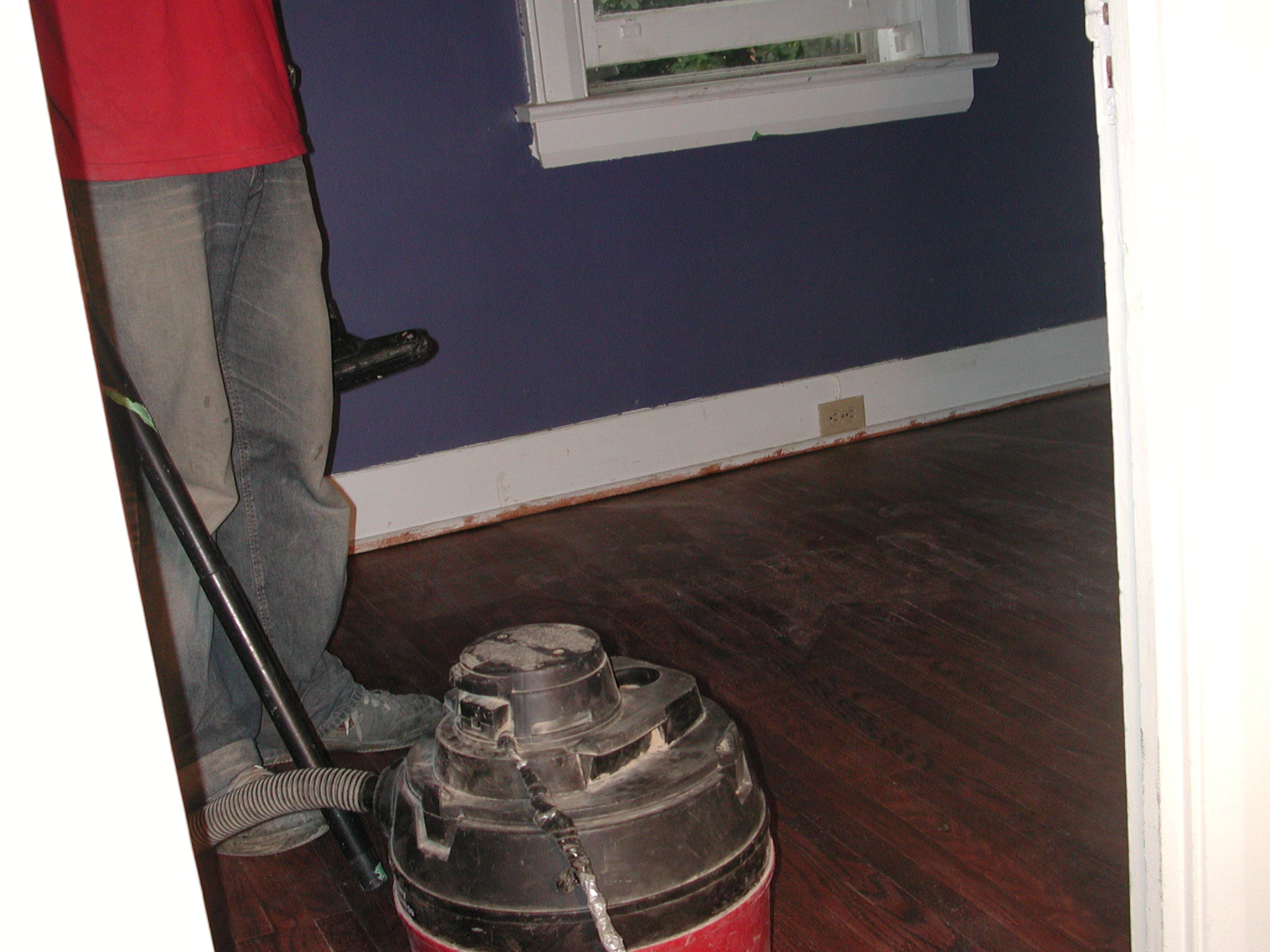 Vacuuming up the dust after buffing the second coat of polyurethane, in preparation for the third.