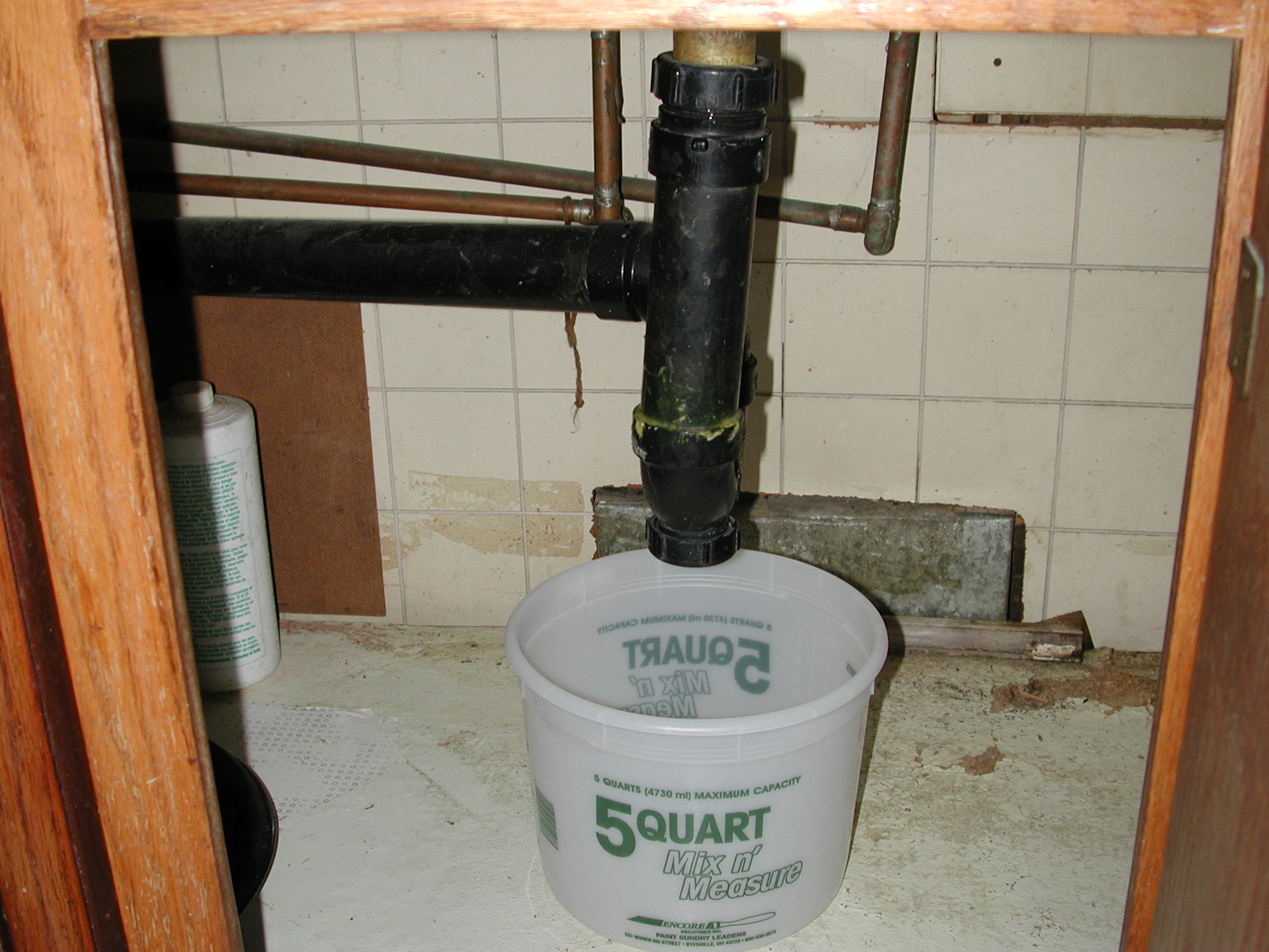 That's because of a leak in the sink trap, which we're now catching in this bucket. Note also that the sink piping goes through the cabinet space, instead of through the wall.