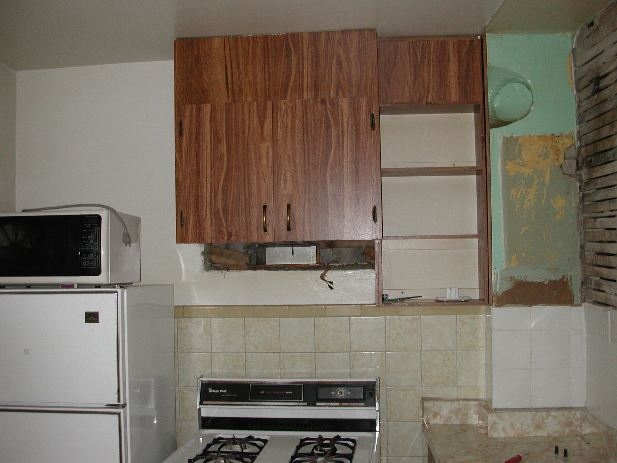 We took the range hood down. This involved some Interweb-searching for what we expected to find back there, electrically. Luckily, it was pretty straightforward. We flipped breakers until we found the one to the hood, and then it was just a matter of unscrewing various parts of the hood until we found the panel covering the incoming wiring.