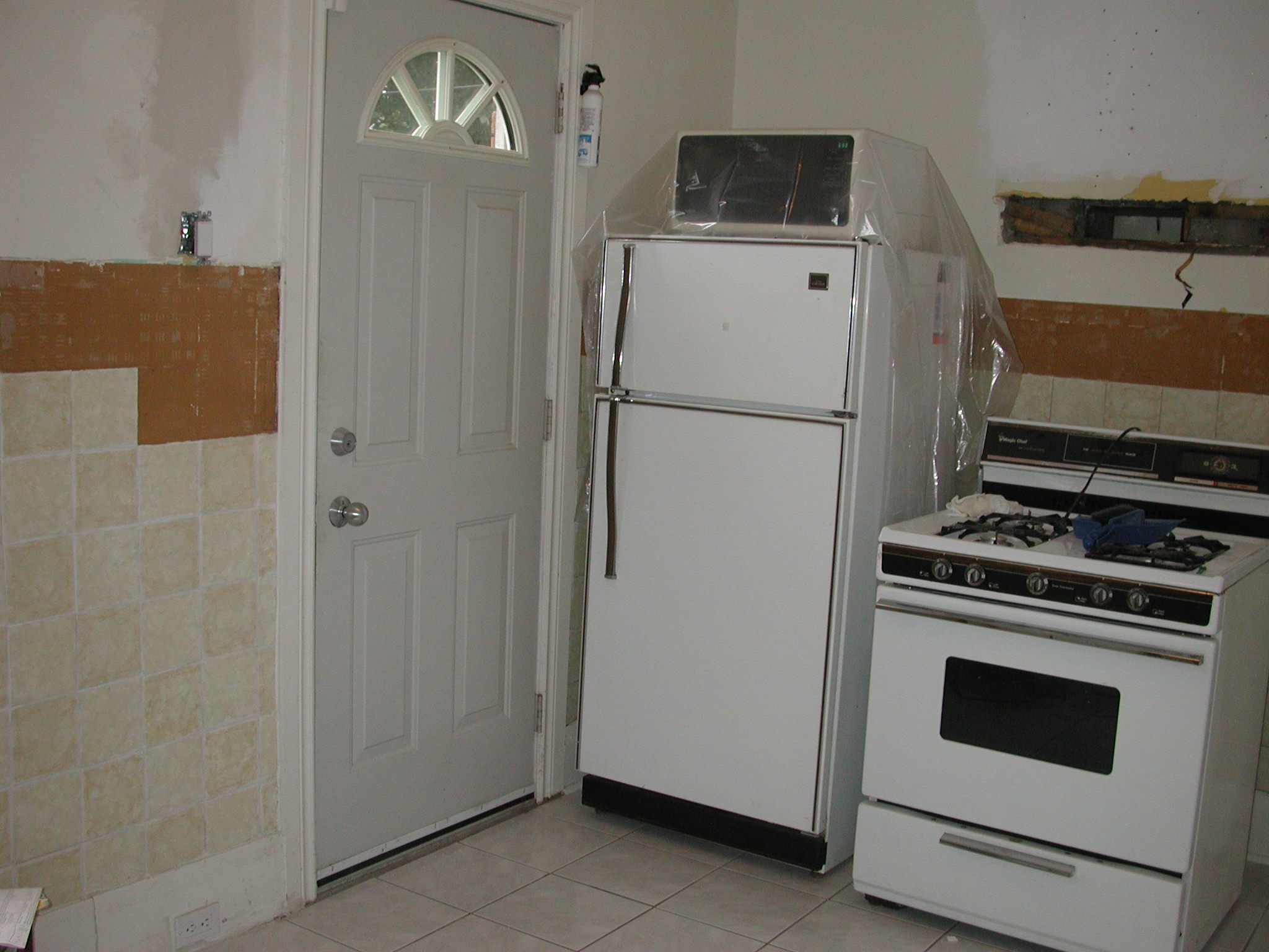 The top cabinets will hang into the area where the tiles on the side wall were, so we removed some of them to make room.