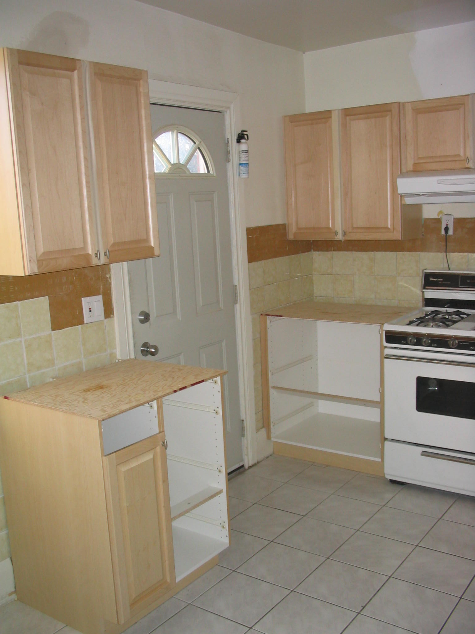 In preparation for the installation of the real countertop, we empty out all of the bottom cabinets.