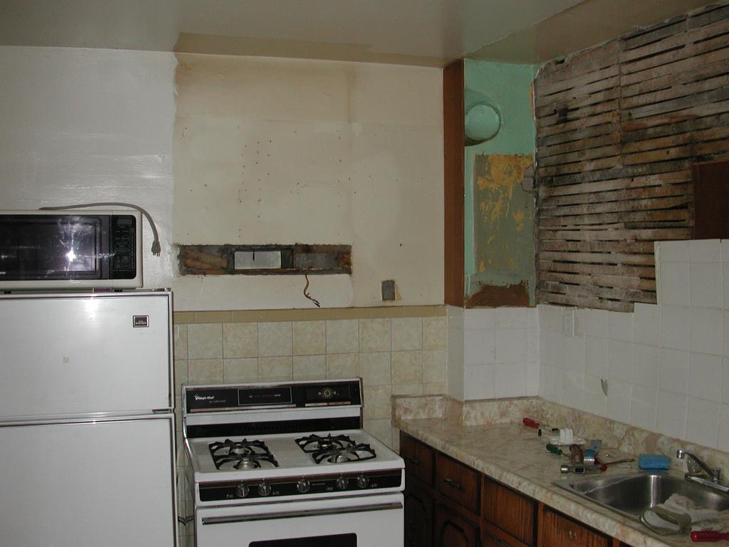 After removing the top cabinets. Luckily, the rest of the wall was present, and in OK shape. It should just need some spackling and cleaning, and not outright replacing, like the wall to the right.