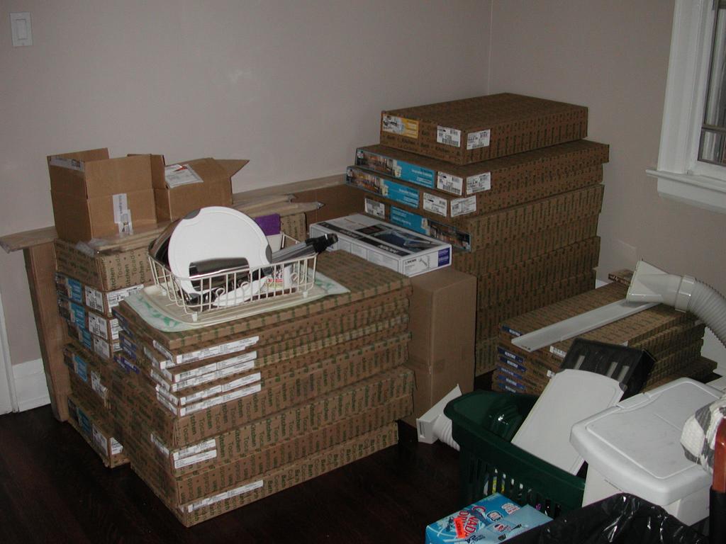 The (43) boxes containing the future kitchen cabinets have finally arrived! For now, they're stacked in the dining room.
