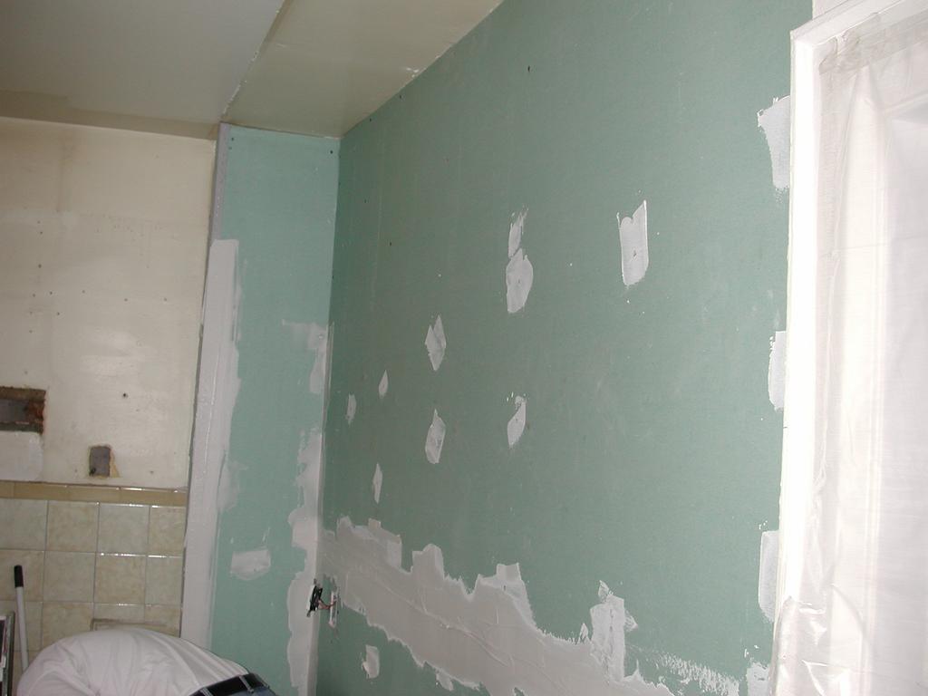 The pipes are done, and the new greenboard goes up.