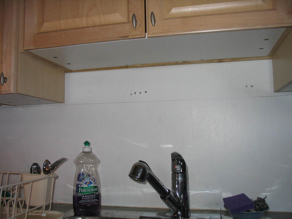 The wall above the sink was in rough shape, because of the failed first attempt to place the cabinet support that didn't take into account the shorter cabinet there.