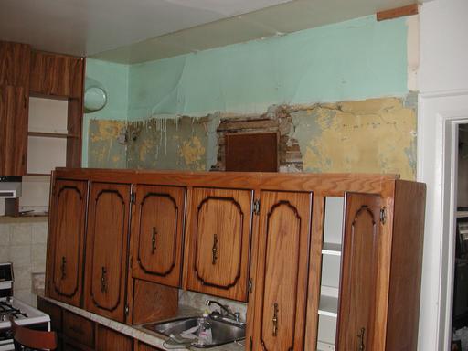 We took down the top cabinets. As we somewhat expected, the wall behind them was a total mess. So we figured we'd just take it down, and replace it with greenboard.