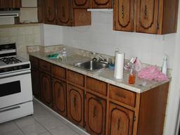 The only counter space. Note that the space next to the stove is useless, leaving only one accessible drawer in the whole kitchen. It turned out that drawer was broken, to boot. :-p