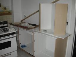 We start putting the cabinets into the kitchen. Note the wackiness in the corner of the room; we had to modify the top and bottom corner cabinets to fit around it.