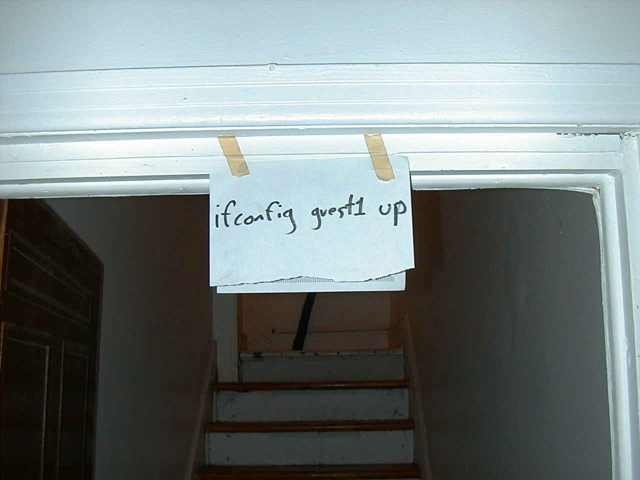 Just inside the door: "ifconfig guest1 up" (instructing the newly-arrived guest to come up).