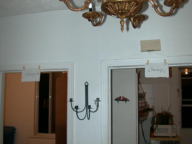 On the door to the second bedroom: "sleep(2)"; on the door to the kitchen: "chomp;".