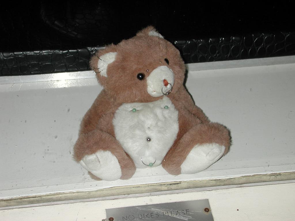 A bear in the window of a piercing shop.