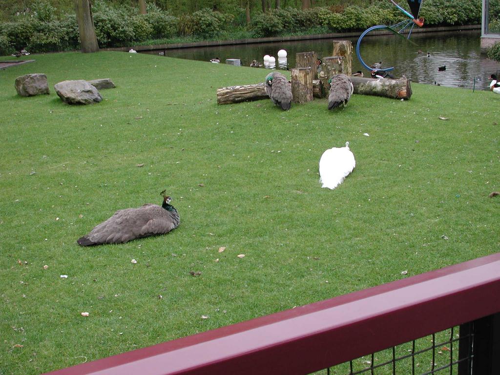 Peacocks in the garden. One is a rare albino.