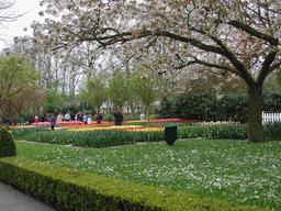 A tree drops blossoms in the garden.
