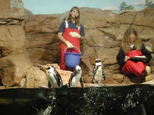 Feeding time for the penguins. The job of the woman at the right is to write down which penguin eats each piece of food, so they can ensure all of the penguins are getting enough.